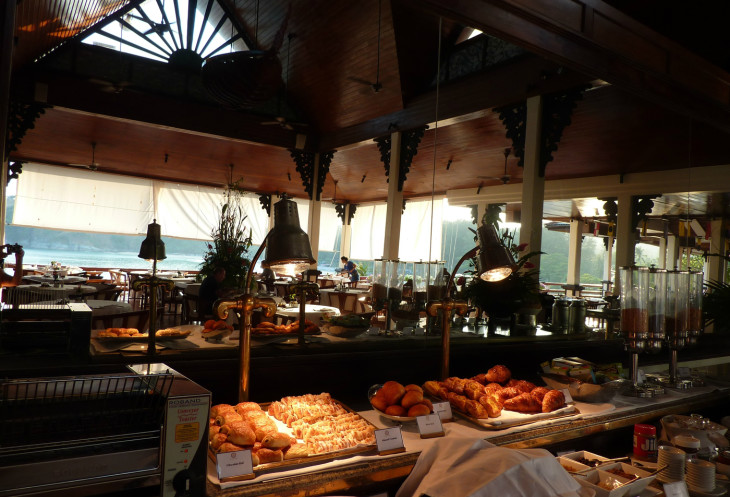 Всегда была какая-нибудь разновидность тайского супа, рис, картофель, фасоль, ветчина, бекон, сосиски 2-3 видов, выпечка, овощи, нарезки, свежеотжатые соки 3-4 видов, горячий хлеб... Здесь же готовят омлеты, можно заказать блюда из меню. Из фруктов всегда арбуз, ананас, папайя, дракон, виноград, манго.