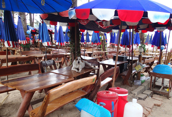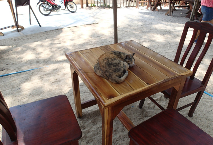 Многочисленные пляжные кошки и псы (здесь их не меряно) падают, где попало спать или (более счастливые и имеющие личных хозяев) расходятся по местам проживания. Да, столики в кафе – излюбленное место ночевки волосатых гурманов…