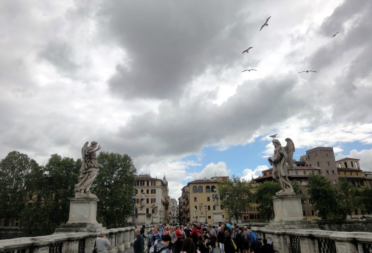 На третий день погода, вновь сменив настроение, подарила хмурое небо. А случайное сплетение улиц очередную порцию эстетического удовольствия, венцом которого стал Мост святого Ангела. Как-то выпал он из моего кругозора, раньше ничего о нём не читала и в свой список обязательных к просмотру достопримечательностей не включала. Ну что же, это был ещё один приятный бонус волшебного города.