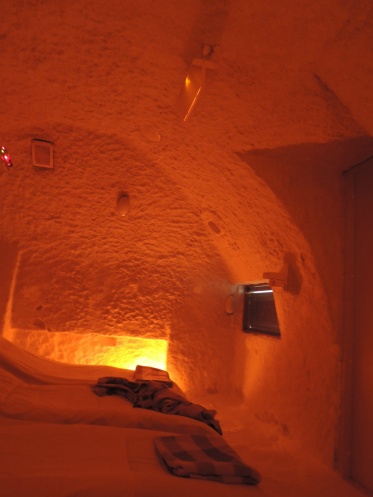 Небольшая комната превращена в сводчатую пещеру, стены которой покрывает соль. Ложишься на мягкий топчан, укрываешься пледом и релаксируешь под музыку. Многие засыпают. Во время процедуры вдыхаешь соляные пылинки, полезные для дыхательных путей и кожи. Часто эта процедура назначается детям, особенно с аллергиями.