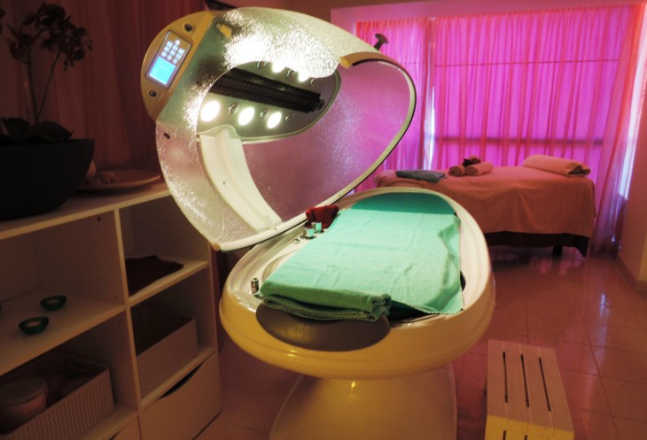 Капсула отдаленно напоминала горизонтальный солярий. Ты в нее ложишься, крышка закрывается, и на воле остается только голова. И пошло-поехало! В ход идут ароматические масла, инфракрасные лучи и массажный душ. Сначала лежишь, как в парилке, и на тельце покапывает масло, а потом добрая капсула обдает тебя контрастным душем. Всё это с двух сторон, во время процедуры несколько раз переворачиваешься.