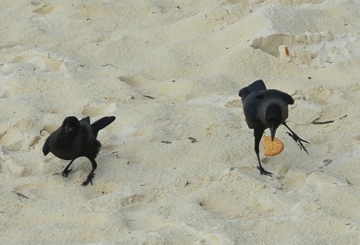 На третьем – вороны, ничем не отличающиеся по сообразительности от соотечественниц. Наблюдал картину, как пара ворон долго пасла цаплю, а как только та поймала рыбу, хитростью отобрала ее (напоминает «Вороне как-то бог послал кусочек сыра…», но наоборот)… Ну а выпросить у туриста кусок еды для них – раз каркнуть.