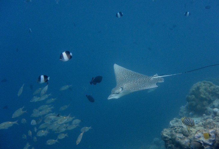 Пользуясь плохим освещением, скат-орляк издалека помахал крыльями, оставшись вне предела досягаемости фотоаппарата.