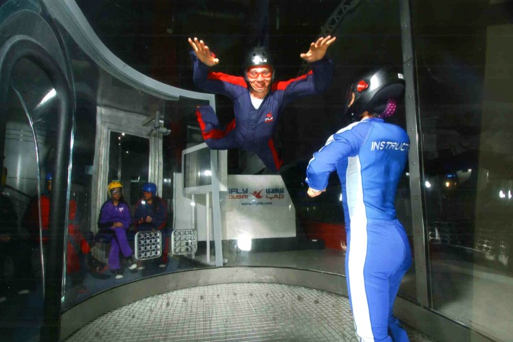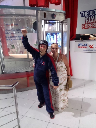 и решили переместится в Merdif City Centre, чтобы полетать в аэротрубе. Сели в такси и за 15 дирх оказались возле входа Merdif City Centre. Центр предлагает уникальные развлечения для взрослых и детей. Но мы держали путь в аттракцион невесомости iFly Dubai. И вот, когда мы оказались возле аэротрубы, и увидели как инструктор летает и показывает мастер класс, струсил даже мой муж. Мы долго наблюдали как делают попытки «новички» и как на втором заходе вместе с инструктором они поднимаются наверх и тут же резко падают вниз и так несколько раз. Ножки мои подкашивались, я отказалась от полета. Тем более купоны в праздники не принимают, поэтому было решено , что мой любимый муж пойдет один. Сначала проводили инструктаж в отдельной комнате