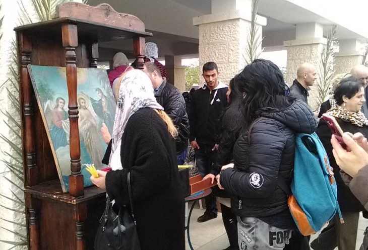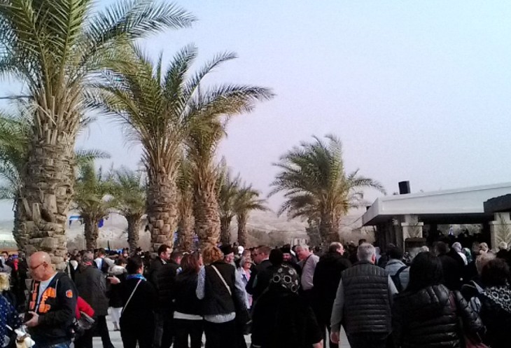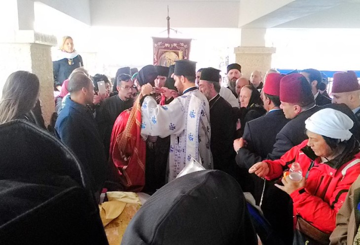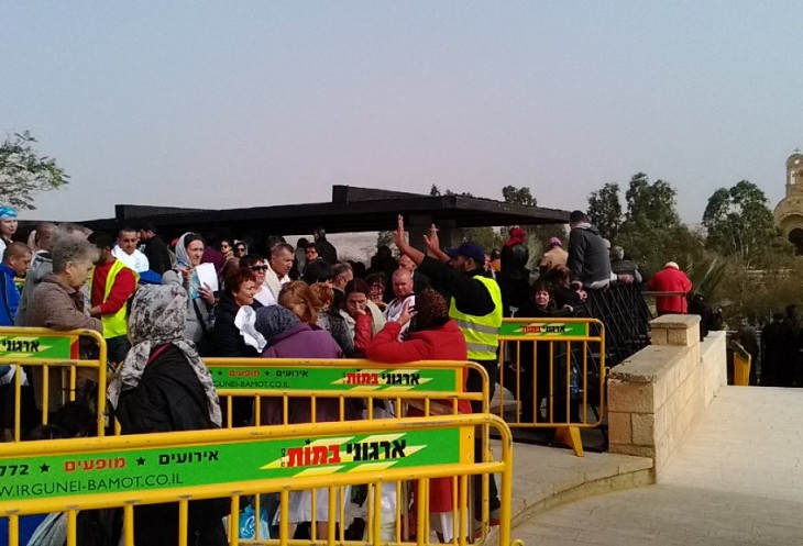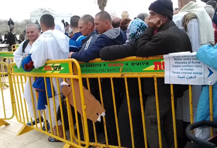 Сам праздник, включающий в себя службу и чин освящения вод реки Иордан, длится около часа. В этом году он начался ближе к полудню. Примерно через час после службы Патриарх Иерусалимский спустился Крестным ходом к водам Иордана. По традиции в воздух был выпущен белый голубь. Происходящее внизу, у реки Иордан, транслировались на экране наверху, где стояли паломники. По окончании торжественной части за процессией из духовенства и помощников, держащих хоругви, пошла часть людей, подбирая за ними с земли веточки и листочки ароматной травы. После отъезда Патриарха и греческого духовенства к реке Иордан начали пускать всех паломников. Очередь из желающих совершить омовение в святых водах реки Иордан была огромная. Температура воздуха в праздничный день была +20. Вода по моим ощущениям была достаточно холодная — около 15 градусов. Но большинство паломников это не остановило. Перекрестившись, они с молитвой погружались с головой в святую воду!
