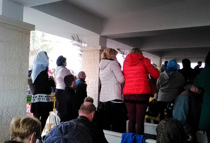 Последние 2 человека из нашей группы вернулись в автобус в 15:30. Пока мы их ждали, над автобусом пролетел белый голубь, а потом сел на колючую проволоку, за которой находятся минные поля. Почти все другие автобусы разъехались, и на реке Иордан стало так тихо, спокойно и умиротворённо, как это бывает там в обычный день. Каср эль Яхуд – хоть и охраняемая, но уже 5 лет как открытая для посещения территория. Потому каждый желающий может приехать туда не только в праздник Крещения Господня, но и в любой другой день.