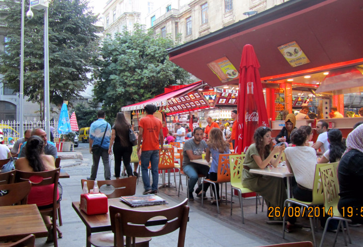 Рестораны и кафе. Район Султанахмет – место огромного количества кафе и ресторанов, для отдыха жителей Стамбула и туристов. Такого большого числа различных кафе и ресторанов, на один квадратный км. Я не встречал нигде. Один ресторан плавно переходит в другой. Ассортимент большой, и как правила есть фото, что можно заказать. Зазывалы и официанты говорят по-русски. Средняя цена, суп 4 турецкие лиры, пиво 9 лир, рыба 50-60 лир, блюда из мяса 25-35 лир. Рестораны работают, до последнего посетителя. Это рестораны для туристов.