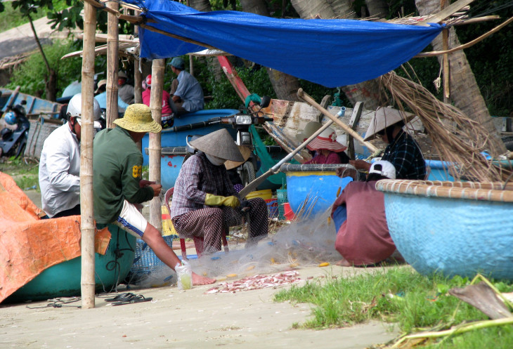 Побережье рыбацкой части Муй Не разительно отличалось от пляжно-отельной зоны. Довольно много мусора на песке, обрывки сетей и рыболовецких снастей. И женщины, перебирающие улов, расположившись прямо на песке.