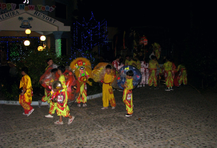 А вечером 31-го декабря в отель, расположенный напротив ресторана, где я ужинал, приехала большая группа артистов с концертно-праздничной программой. Зрелище было очень красочное – артисты, в том числе многие детского возраста, одетые в яркие костюмы, привлекли внимание не только гостей отеля. Но и желающих полюбоваться шоу, заглянувших просто с улицы. Я случайно оказался в их числе и постарался запечатлеть шествие артистов.