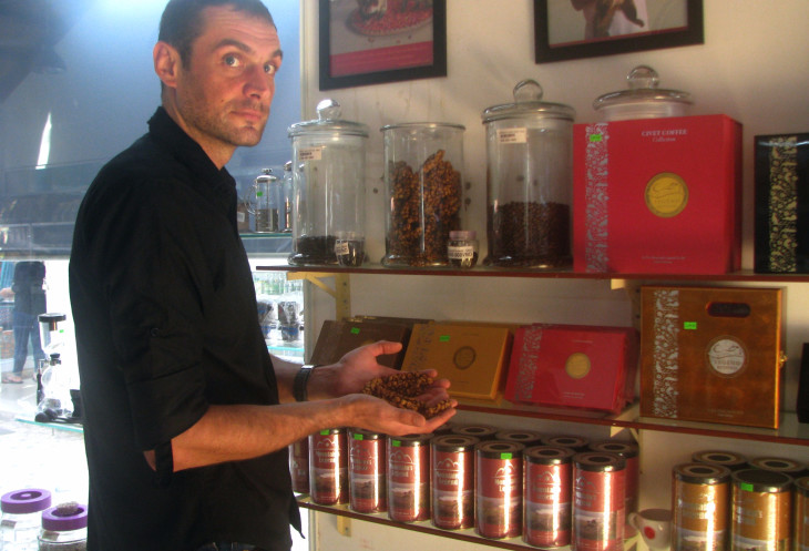 А во время первой экскурсии в Бао Лок в октябре у нас было обстоятельное знакомство с «чайным заводом». По рекомендации друзей из местного туристического агентства я попал в магазин «Кофе и чай», расположившеийся рядом с супермаркетом «Перекрёсток» в центре Муй Не. Сотрудник магазина, приехавший несколько лет назад из нашей необъятной страны, Денис, дал очень много ценной информации о сортах кофе, включая элитный лювак.