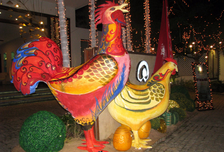 Как я уже упоминал, моя вторая поездка пришлась на новогодние каникулы. Хотя жители Вьетнама празднуют наступление нового года по лунному календарю, работники туристической сферы отдали должное гостям, преимущественно европейцам. Многие отели были украшены новогодней символикой, включая изображения петухов в честь «года петуха».