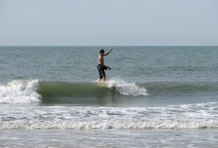 Если я правильно догадываюсь, бухта предназначена для флота рыбацких лодок-тазиков. Они в большом количестве стоят на берегу рядом с дорогой. И во время прилива морская вода не достигает места их «парковки». Обстоятельством защиты от сильного ветра, и, соответственно, не очень сильных волн, пользуются любители кататься на досках – покорители волн – сёрферы. Мне удалось сделать немало очень интересных фотографий любителей и профессионалов этого вида спорта.