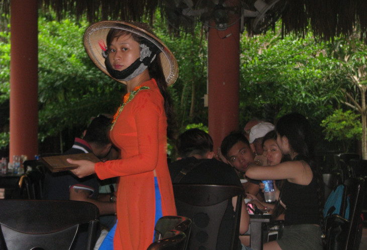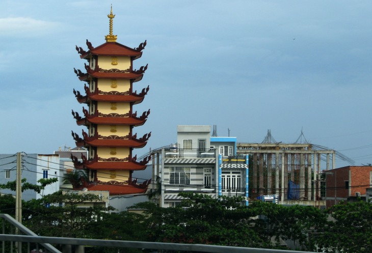 Гид – вьетнамец по имени Кьен очень хорошо говорил на русском языке. И мы были полны ожидания многочисленных экзотических видов, обещанных во время сегодняшней экскурсии. Путь пролегал через Хо Ши Мин, где очередной раз поразило скопление мотобайков. И вполне современные постройки в стиле традиционных пагод.
