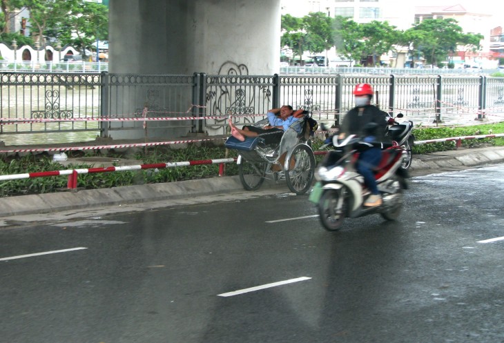 Дождь стихал, практически прекращался, но весь обратный путь к причалу, на котором остался наш микроавтобус, проходил в тех же серых сумерках, как и начало водной части экскурсии. И лишь по пути к Хо Ши Мин-сити начало проглядывать солнце. Свежевымытые дождём улицы города встретили нескончаемыми табунами мотобайков. Все они куда-то спешили, и лишь один раз я поймал в кадр спокойно отдыхающего на обочине пассажира. Но его транспортное средство явно было прицепом, отстёгнутым от мотобайка, что и позволяло безмятежно спать, уютно расположившись в этом кресле на колёсах.