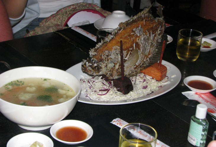 На этом активная часть экскурсии завершалась и оставалась только самая «вкусная» часть – обед в большом ресторане, расположенном под гигантским шатром почти на самом берегу. Наша небольшая группа разместилась за одним столом. Самым запоминающимся оказалось рыбное блюдо. Жареная (или запеченная) рыба размещалась на большом блюде, закрепленная специальными подпорками в вертикальном положении.