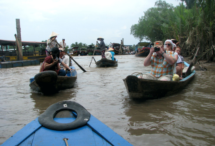 Видно, хозяевам этого водного шоу было невыгодно гонять порожняком транспорт. Наши же лодки вышли в Меконг, где стояли катера, на которых мы пришли от пристани. Лодки выходили из канала с завидной регулярностью и утыкались друг в друга, пока кормчие не распихивали их в разные стороны.
