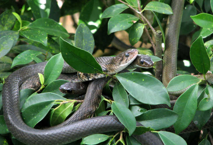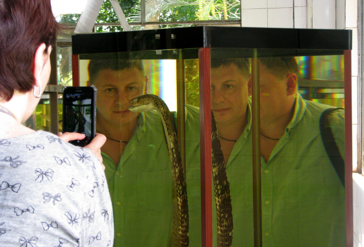 С помощью длинной палки, оканчивающейся металлическим крюком, служащая возвращала кобр, которые стремились убежать из «песочницы» в воду, налитую по периметру бассейна. И эти попытки нарушить спокойную жизнь змей приводили к тому, что у некоторых из них раздувались «щёки». Долго задерживаться у кобр мы не стали, нас отвели к «змеиному дереву». На ветках небольшого кустарника разлеглись несколько десятков змей разной расцветки.