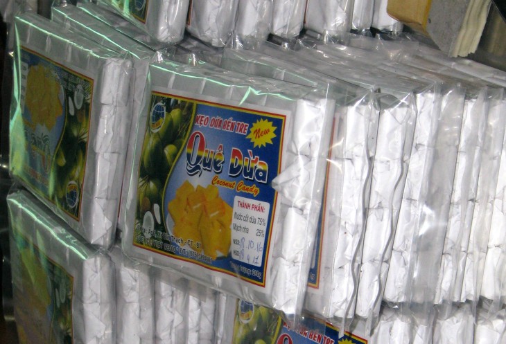 На кондитерской фабрике, скорее, по моему мнению, небольшой мастерской, нам продемонстрировали процесс приготовления конфет из твёрдой массы внутри кокосового ореха. Специальной фрезой эта масса превращается в стружку, которую затем уплотняют, раскатывают наподобие теста и режут на полоски. Эти полоски разделяют на маленькие квадратики, которые и являются «кокосовыми конфетами». Естественно, при фабрике продают готовую продукцию.