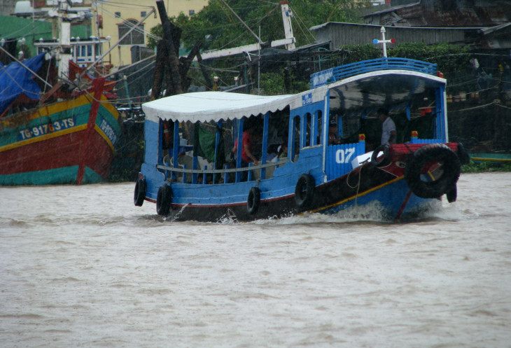 Солнце благоприятствовало фотосъёмкам в питомнике, но по пути к главной части нашей программы - Меконгу стало прятаться за плотные тучи. А когда мы подъехали к пристани, начался дождь, подпортивший настроение. У меня была защита от дождя – лёгкая накидка-плащ, не раз выручавшая на других экскурсиях во Вьетнаме и Таиланде. Но фотографировать в таких условиях было бы затруднительно.