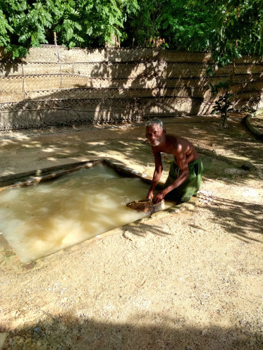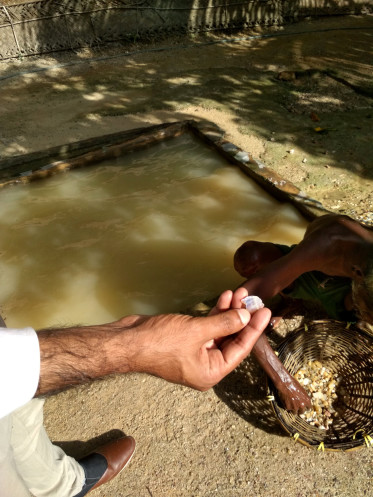Под навесом с каркасом из бамбуковых шестов стояло деревянное сооружение с большим воротом, как у нас на деревенских колодцах. Рабочий спускался в большой бадье в шахту на глубину около 20 метров, как пояснил мне сотрудник фабрики. Там рабочий набирает породу с камнями и насыпает её в ведро. Ведро поднимается на поверхность с помощью того же ворота. Другой рабочий выливает содержимое ведра в деревянную корзину и промывает породу в луже размером с метр на два.