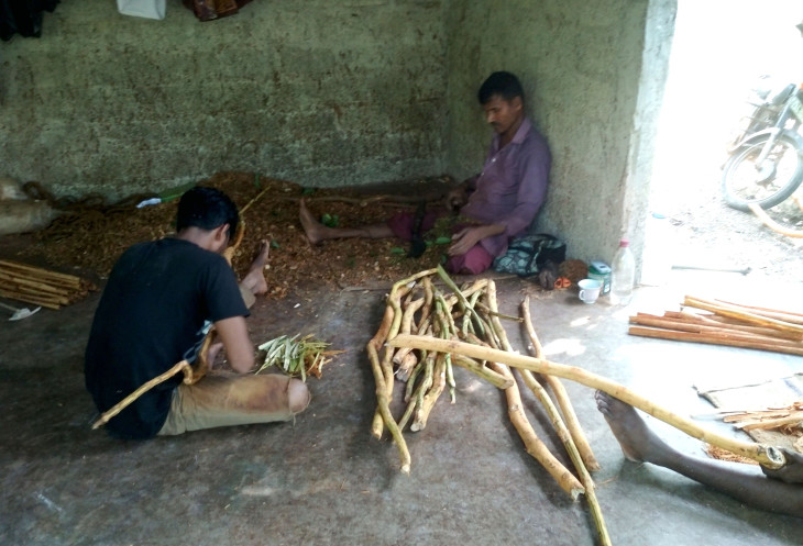 Рабочий день у сопровождавшего меня сотрудника фабрики заканчивался, и он по пути к тук туку остановился в месте «обработки коричного дерева». Трое мужчин, расположившись на полу небольшого помещения, просто снимали ножами кору с толстых ветвей.