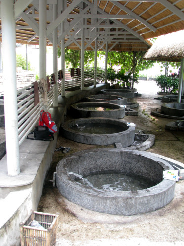 Солнце смилостивилось над моими фотопристрастиями и время от времени являет свой яркий лик. К тому моменту, когда нас проводят к термальным ваннам, полуденный зной даёт себя знать. И наши дамы, переодетые в купальники, которые потом будет не жалко выбросить после грязевой процедуры, для начала забираются в бетонные купели с водой из термальных источников.