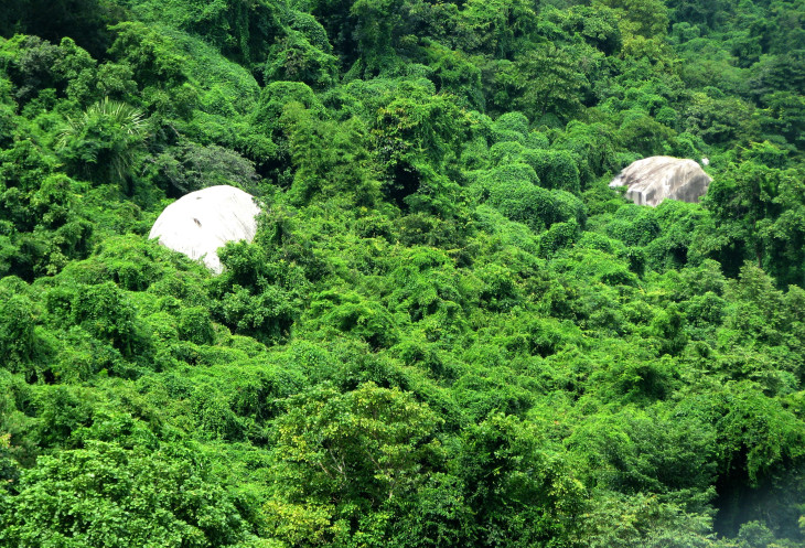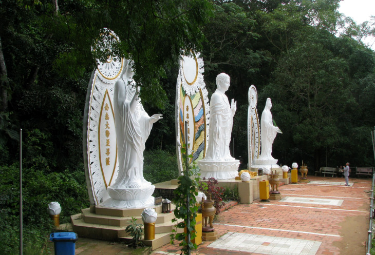 Переменная облачность, с одной стороны, спасала от излишней солнечной радиации. С другой стороны, фотографии получались не такими сочными, как они выглядели в отзывах, прочитанных мной до поездки во Вьетнам. Однако высокая влажность воздуха ощущалась даже на высоте горы, где расположена статуя Будды. Хорошо, что мы не паломники, которые преодолевают весь путь пешком. К нашим услугам комфортабельный вагончик подвесной канатной дороги, из прозрачной кабины которого я успел сделать несколько снимков по пути наверх. В отличие от вагончиков подвесной канатки над морем к острову развлечений Винпёрл, кабинки на горе Та Ку представляют бОльший обзор за счёт панорамных стёкол.