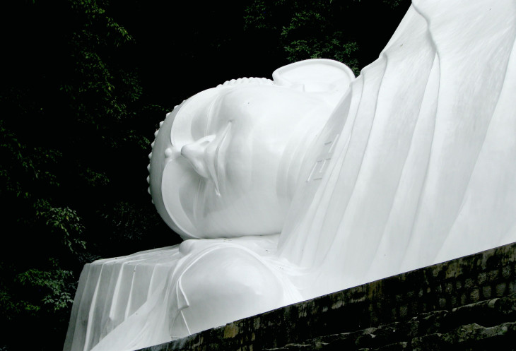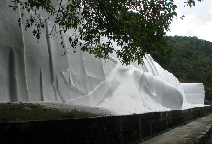 Красочно оформленные атрибуты буддизма постоянно отвлекали меня от рассказа Ивана. Поэтому не буду пытаться предоставить читателю искажённую моими субъективными представлениями информацию. Сбиться с дороги невозможно – вокруг джунгли, дорога к великолепному творению - Будде, лежащему в состоянии нирваны очевидна. По пути остановился только перед тремя большими статуями стоящего Будды, настолько белоснежным, что даже при рассеянном освещении их пронзительная белизна режет глаз.