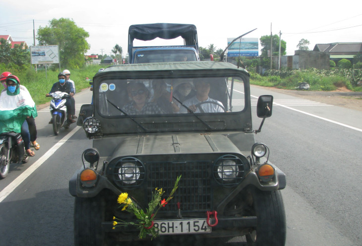 Трудовой день местных жителей начинается рано, и на дороге нередко встретишь мотобайки, гружённые по моим представлениям сверх меры. А следовавший за нами несколько километров внедорожник с улыбчивыми пассажирами радовал неожиданным местом расположения букета полевых цветов.