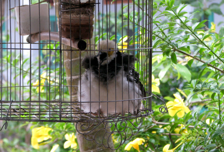 Во время еды совершенно необычные «звуки из джунглей» привлекают моё внимание. Когда еда закончена, я направляюсь в поисках источника этих звуков. Их издаёт небольшая взъерошенная птица, по виду напоминающая большого птенца, сидящая в клетке на задворках ресторана.