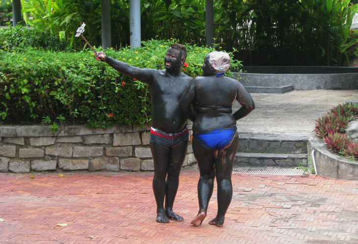 Я не испытываю желания «омолодиться в грязи» и основательно (не без злорадного удовольствия, присущего супругам с сорокалетним стажем совместной жизни) пачкаю тело жены в местах, недоступных её рукам. Получив целеуказание: «ну уж хватит, иди к своим цветочкам», оправляюсь точно по адресу. Тут как нельзя более кстати, солнце ярко освещает всю декоративную флору вокруг грязевых ванн. Там же ухватываю живописную сценку селфи наших спутников по экскурсии.