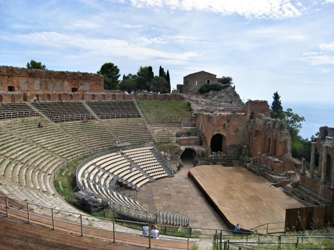 Высеченный в скале грандиозный греческий театр Таормины, превращенный римлянами в арену для гладиаторских боев, окружен зарослями кипарисов и опунций.