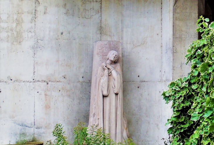 автор оригинального проекта Луис Арретче. Украшение церкви - мозаичная стена, собранная из остатков витража церкви Сен-Венсан, разрушенной прямым попаданием английской бомбы во время Второй мировой войны