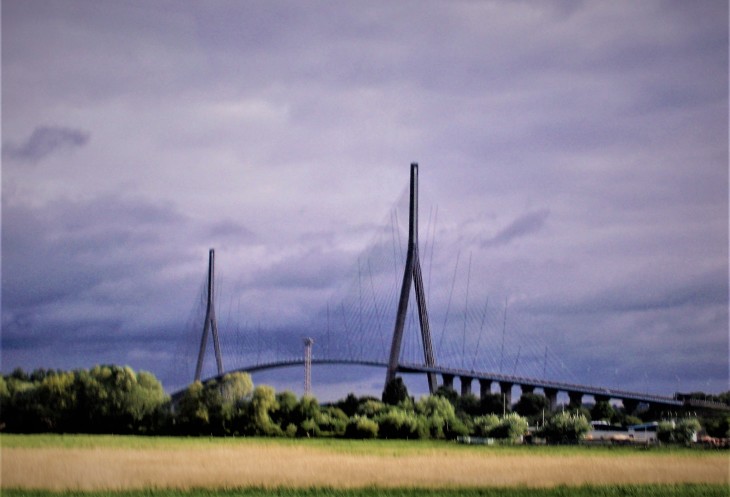 Общая длина: 2 143 м с центральным пролётом в 856 м, высота пилонов, на которых держится этот пролёт – 215 м. Начало строительства 1988 год, открыт 20 января 1995 года. Спроектированный французским инженером Мишелем Вирложо, мост пересекает устье Сены между Гавром и Онфлёром