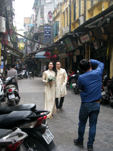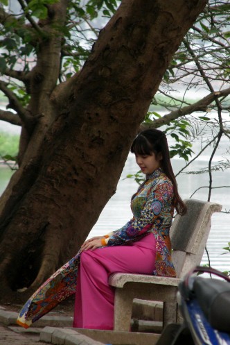 Неспешная прогулка в сторону мавзолея вывела меня к большому озеру, на берегу которого меня ждал сюрприз. Я обратил внимание на группу молодых женщин в красивых ярких нарядах. И фотографа с приличной оптикой, фотографирующего одну из них, демонстрирующую, как я подумал, наряд. Эта группа вьетнамок так заинтересовала меня, что я приблизился к ним и спросил разрешения сделать фотографию. Меня приняли благосклонно, и я предложил присоединиться самой юной «фотомодели», позировавшей фотографу в отдалении, ко всей группе.