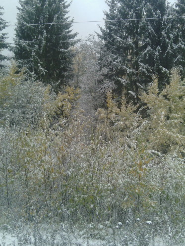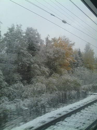 Сквозь дрему я углядела, что камни около железнодорожного полотна белые. Ну не мрамором же засыпали рельсы?! Приглядевшись, я поняла- это снег ( мы въехали в ту самую полосу облачности, что шла за солнцем). Спустя пару километров снегом были уже покрыты и лес, и кусты.