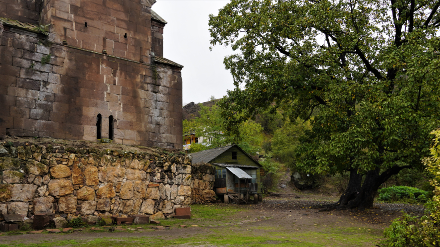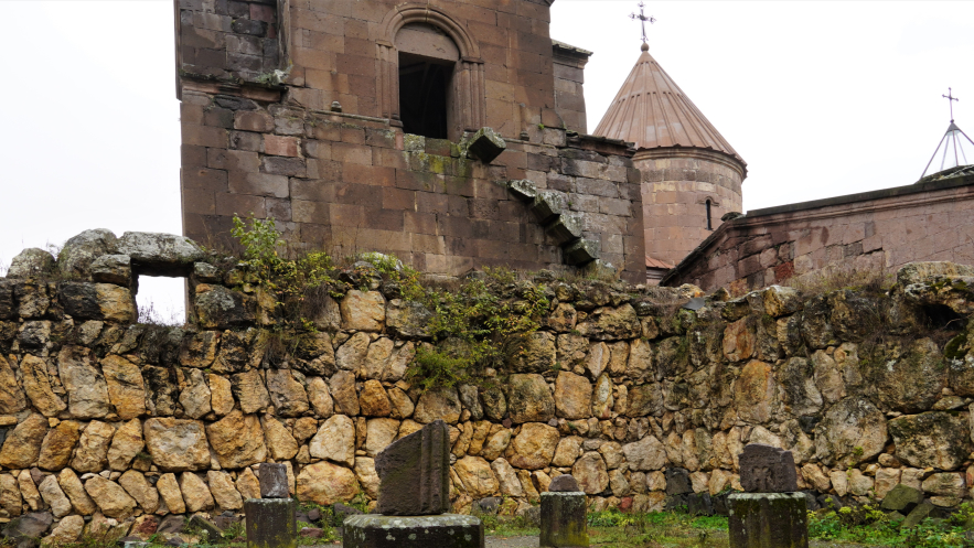 Из Агарцина мы двинулись в Гошаванк. Очень удачно: турист может решить, что для него более приемлемо, - реставрация или консервация. Потемневшие от времени древние стены (пасмурный день тоже делал свое дело) венчали два «зонтика», наверное, из поликарбоната (или чего-то подобного).