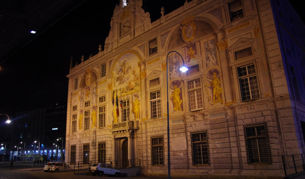 Великолепный фасад здания в бирюзово-белых тонах смотрит сегодня прямо на морской порт. Внешние стены декорированы золочеными скульптурами, лепниной и фресками эпохи Возрождения, центральная из которых выделяется изображением святого Георгия, убивающего дракона. Сюжет этот не случаен – святой Георгий считается небесным покровителем Генуи.