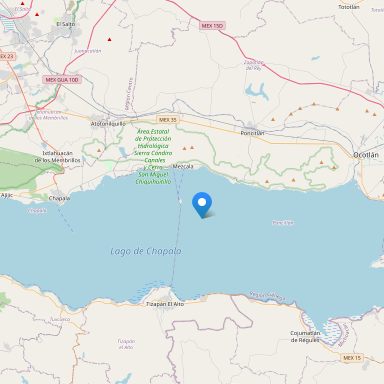 Невзирая на свои внушительные размеры, озеро Чапала имеет небольшую глубину, среднее значение которой составляет всего четыре с половиной метра. На озере расположены три небольших острова: остров Alacranes (самый большой), остров Mezcala (средний) и остров Menor (самый маленький).