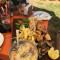 Примерно все по 50:Картофельные самодельные чипсы,5 креветок(пробовали-вкусно:),порезанный манго ну и много всего разного.